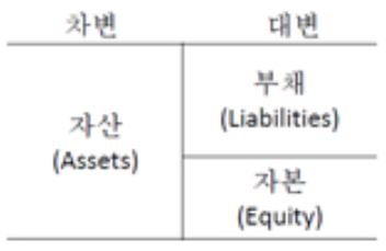 재무상태표는 자산을 왼쪽에 두고 부채와 자본을 오른쪽에 나타내며, 회계에서는 왼쪽을 차변, 오른쪽을 대변 이라고 합니다.