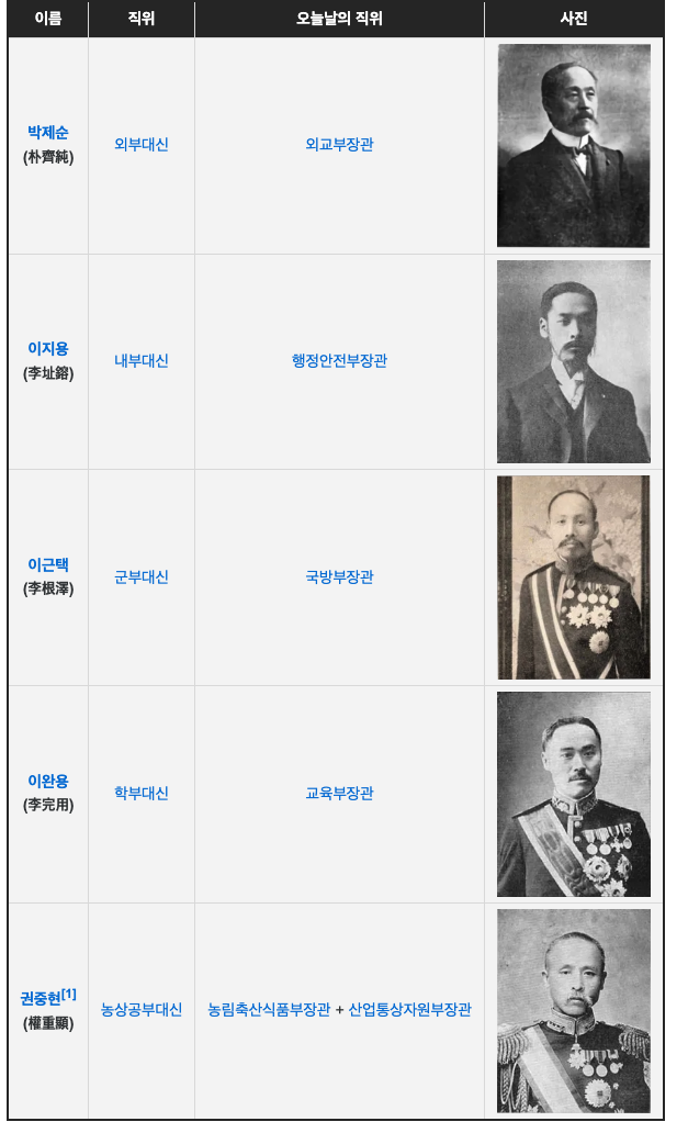 한국의 인원으로 이 늑약에 찬성하여 서명한 다섯명의 친일반민족행위자 매국노를 뜻하는 말이다.