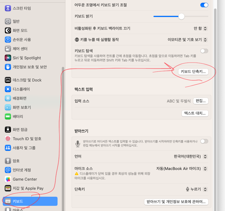 4. 맥북에서 시스템 설정 > 키보드 > 키보드 단축키 선택