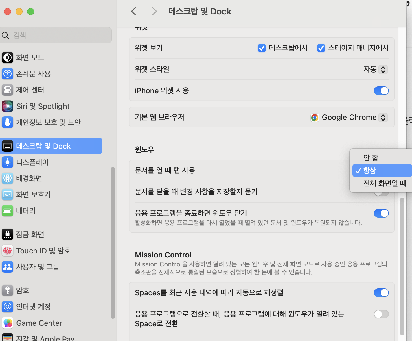 을 클릭 - 오른쪽에 있는 윈도우로 이동하여 ‘문서를 열 때 탭 사용’ 옆에 있는 팝업 메뉴를 클릭하고,