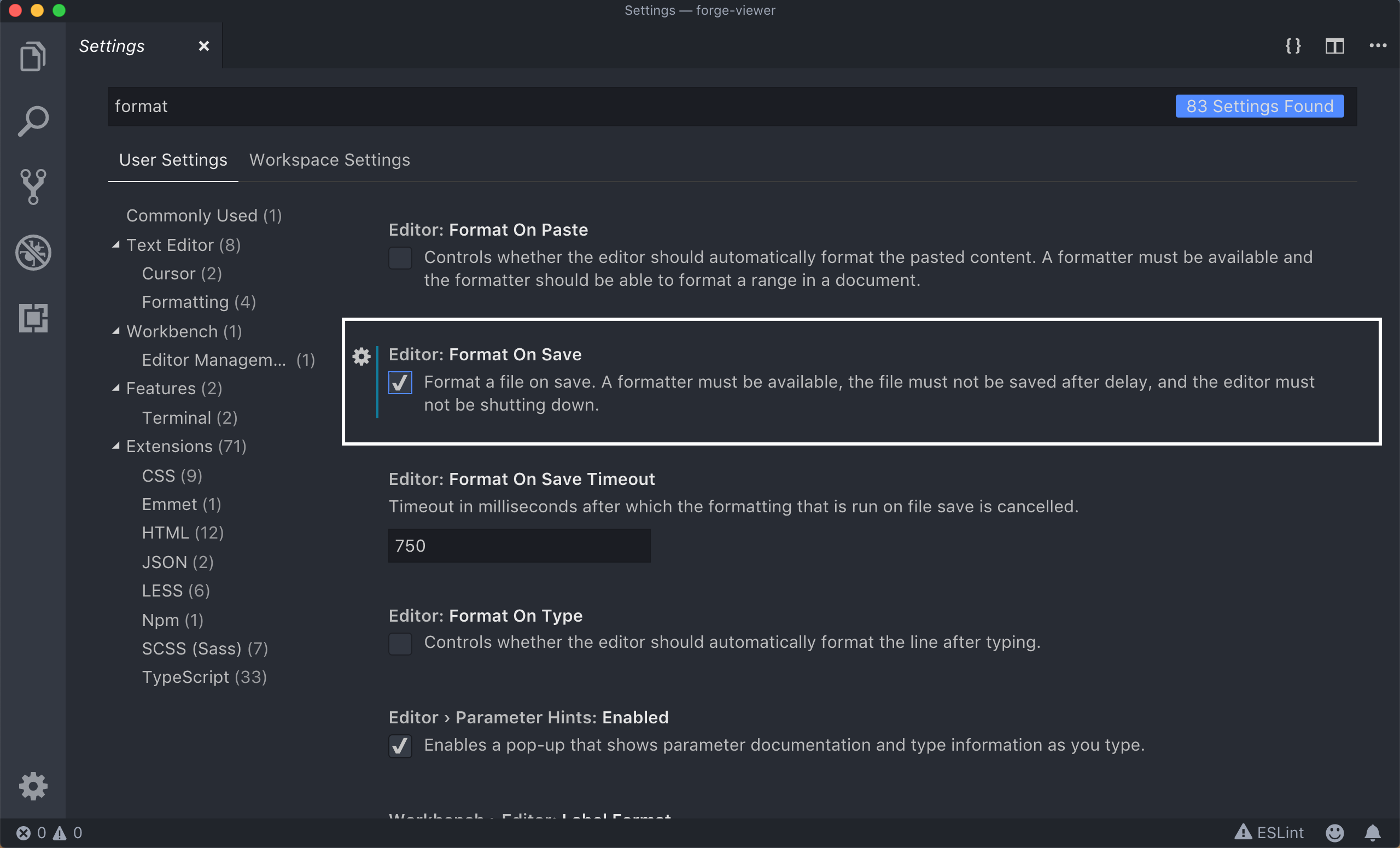 6. 상단의 검색창에 이번엔 format 으로 검색 후, 나오는 결과중 Editor: Format on Save 에 체크