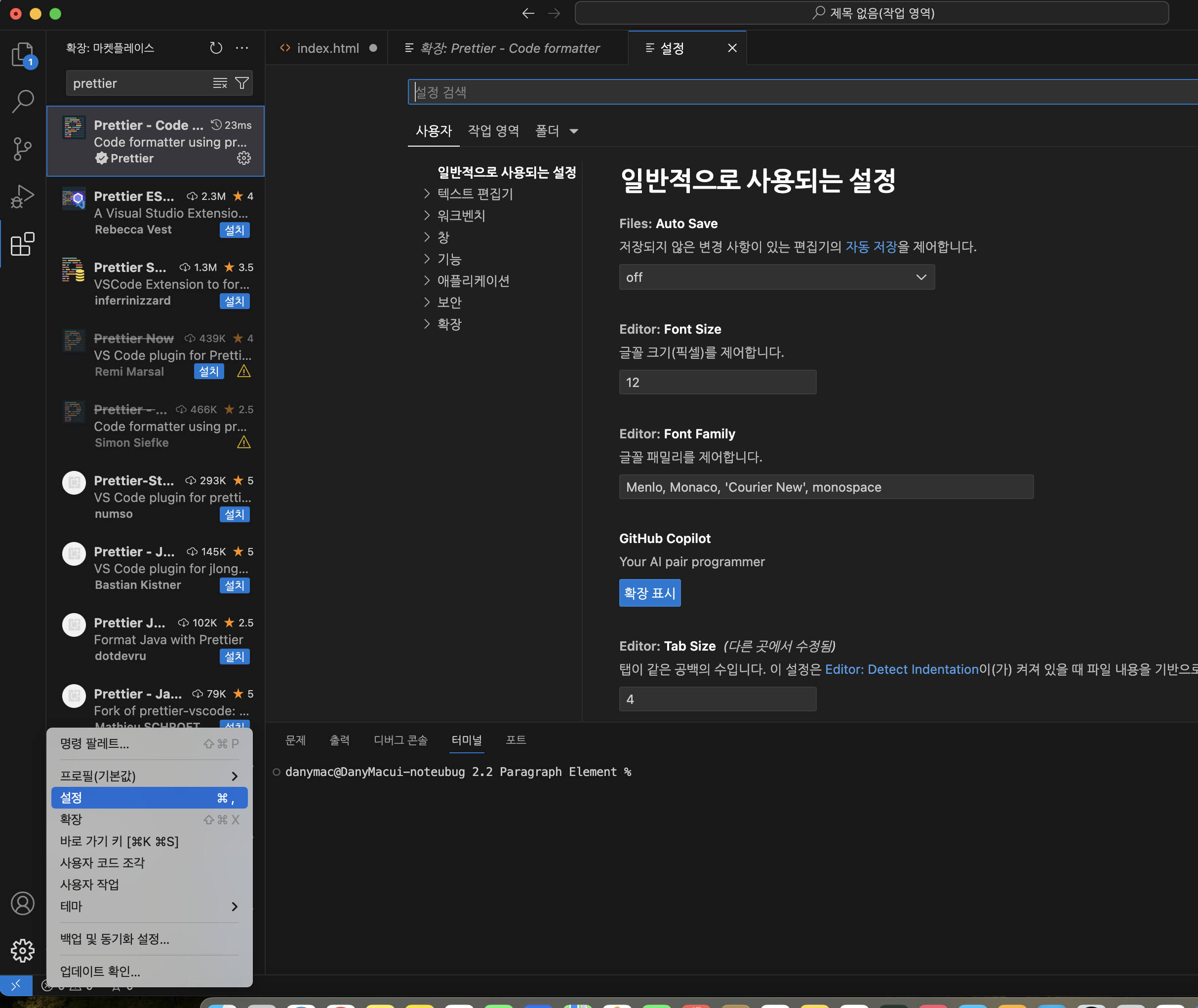 prettier 는 자동들여쓰기 등을 해주는 정말 편리한 툴입니다.