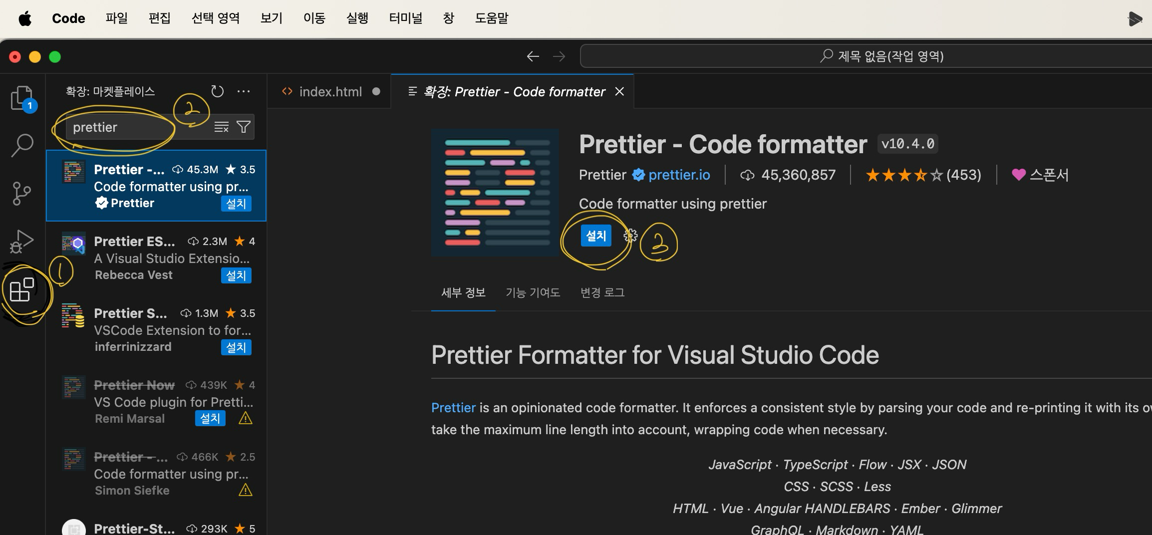 2. 확장화면 검색창에 prettier를 입력하여 검색