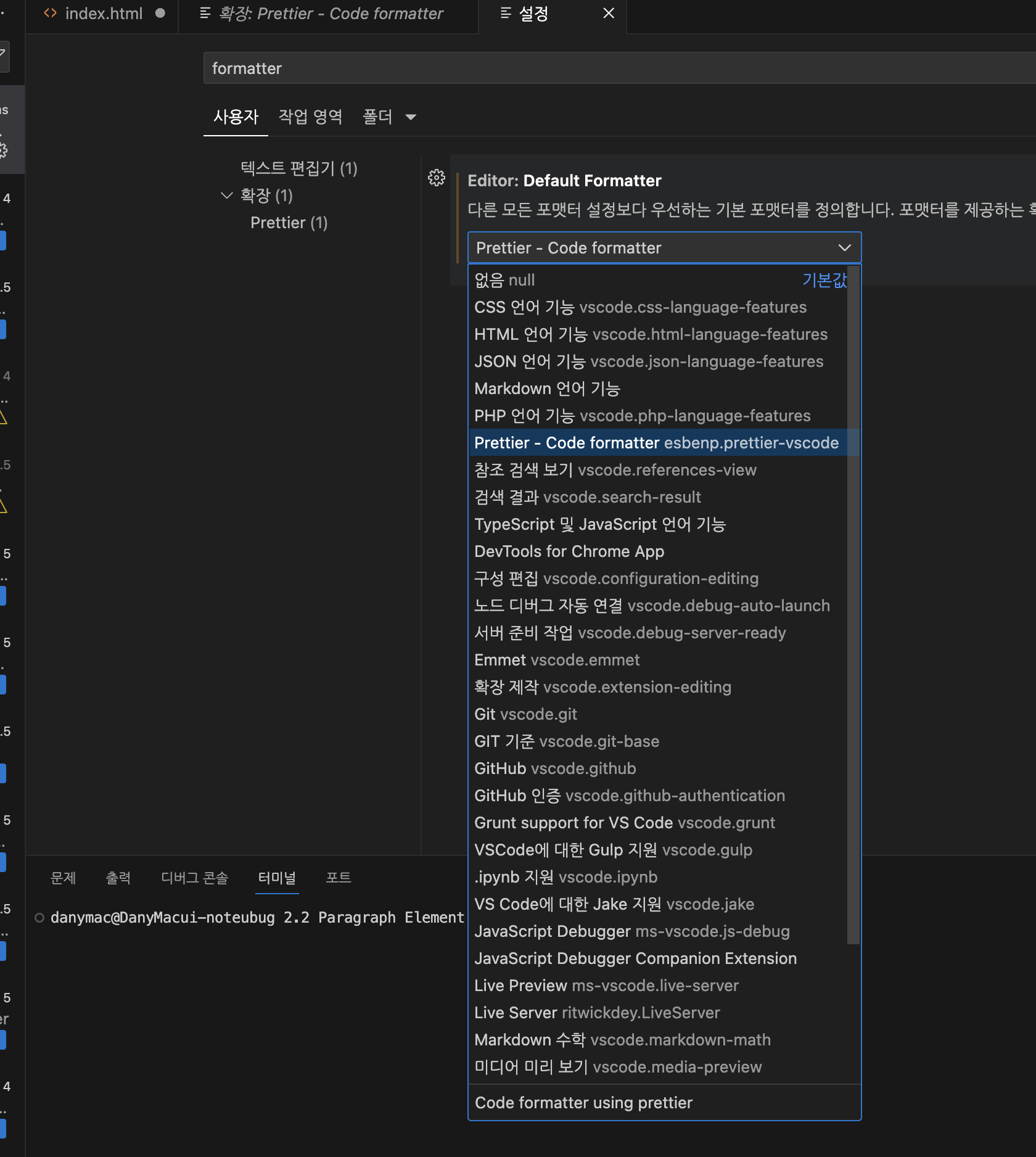 5. 설정에서 나오는 검색창에 formatter 입력 후, 나오는 검색결과들 중, Default Formatter 에서 '없음' 을 'Prettier - Code formatter' 로 선택 변경