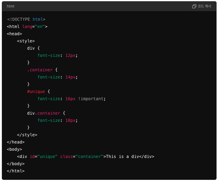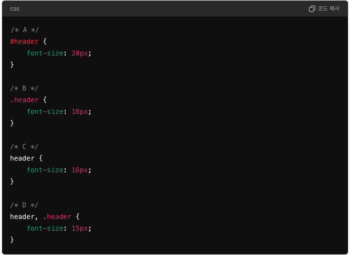 - 우선순위가 가장 높은 규칙은 #header { font-size: 20px; }입니다. ID 선택자가 클래스와 요소 선택자보다 특정성이 높습니다.