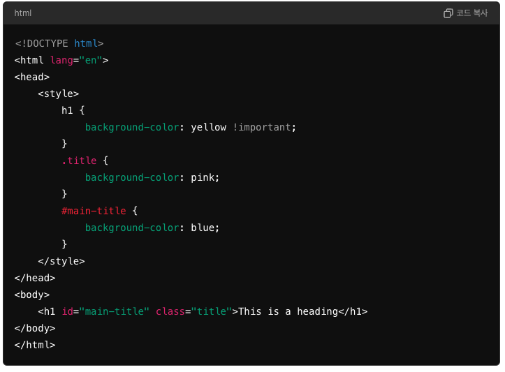 - h1 요소의 최종 배경색은 yellow입니다. !important 플래그가 가장 높은 우선순위를 갖습니다.