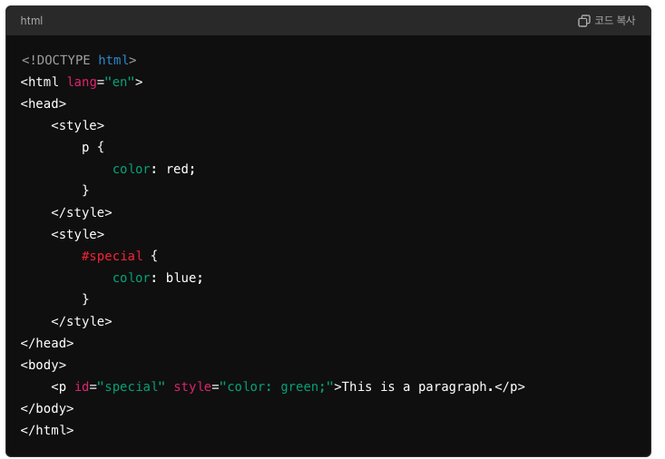 - p 요소의 최종 색상은 green입니다. 인라인 스타일이 모든 다른 스타일 규칙보다 우선순위가 높습니다.