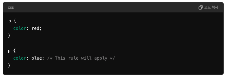 동일한 특정성을 가진 규칙이 충돌할 경우, 나중에 정의된 규칙이 우선 적용됩니다. 이는 CSS 파일 내에서의 순서뿐만 아니라 HTML 문서 내에서의 <style> 태그 순서도 포함합니다.