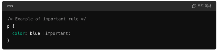 !important 플래그를 사용한 스타일 규칙이 가장 높은 우선순위를 갖습니다. 이는 특정성과 출처에 관계없이 항상 우선 적용됩니다.