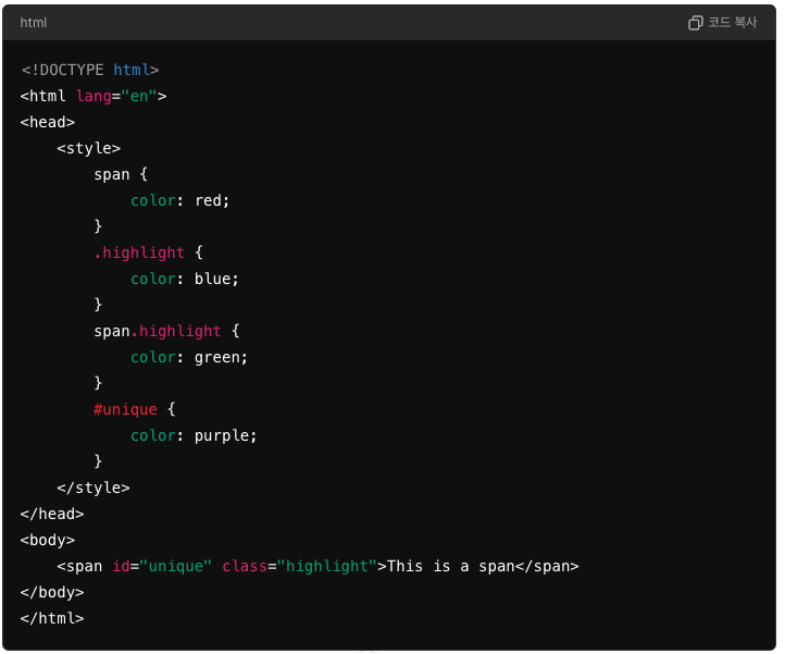 - span 요소의 최종 폰트 색상은 purple입니다. ID 선택자가 클래스와 요소 선택자보다 특정성이 높습니다.