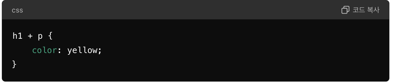 - 인접 형제 선택자(+): 특정 요소 바로 다음에 오는 형제 요소를 선택합니다.h1 바로 다음에 오는 p 요소를 선택합니다.