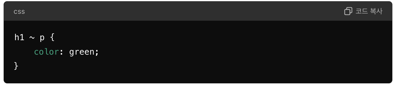 - 일반 형제 선택자(~): 특정 요소 이후의 모든 형제 요소를 선택합니다.