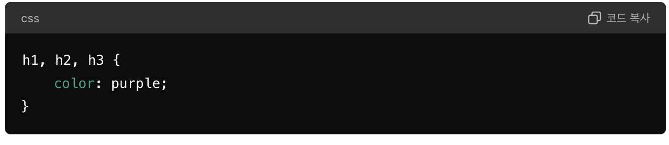 4. 그룹 선택자(쉼표): 여러 요소를 한꺼번에 선택합니다.h1, h2, h3 요소를 모두 선택합니다.