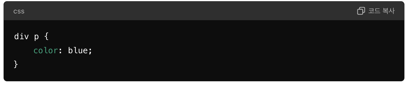 1. 후손 선택자(공백): 특정 요소의 모든 후손 요소를 선택합니다.