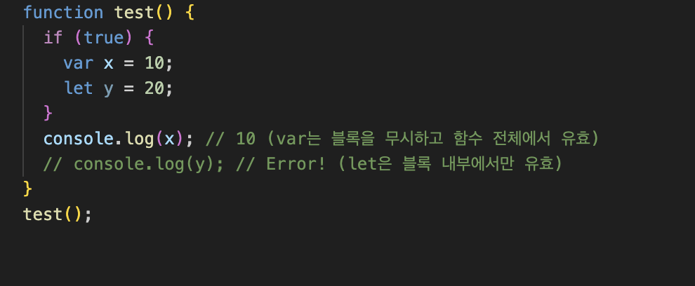 - var는 함수 스코프를 가지며, 블록 스코프를 무시합니다.