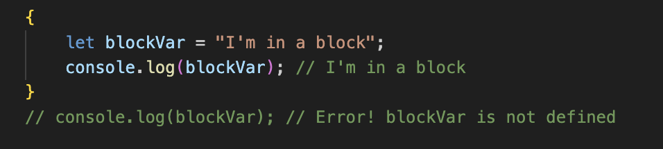 - 블록({}) 안에서만 유효하며, 블록 밖에서는 접근할 수 없습니다.