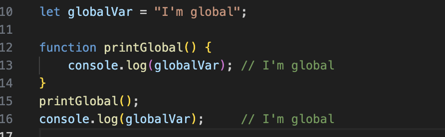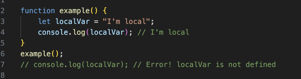 - localVar는 example 함수 내에서만 접근할 수 있으며, 함수 외부에서는 접근 불가능