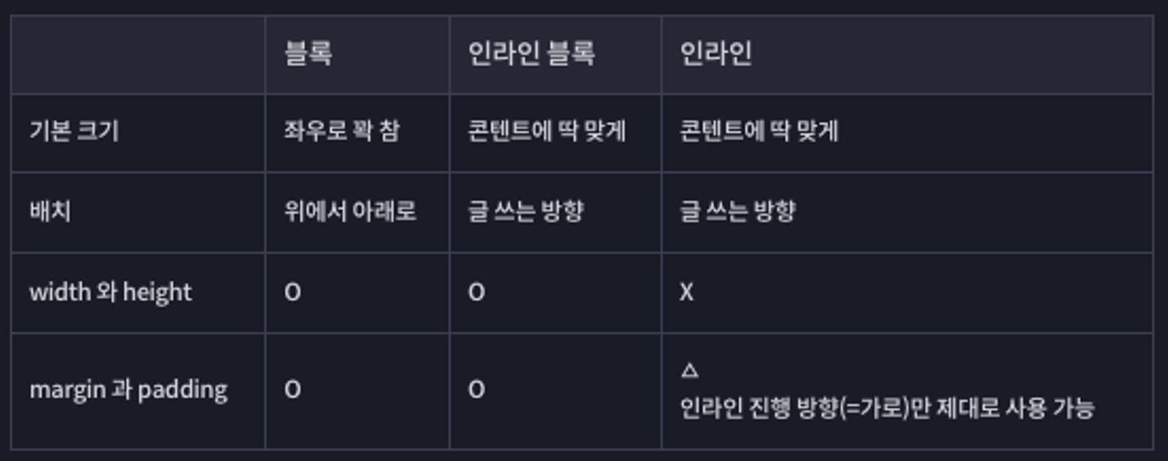 | margin/padding 적용 범위 | 상하좌우 모두 적용 | 좌우만 적용, 상하는 적용되지 않음 |
