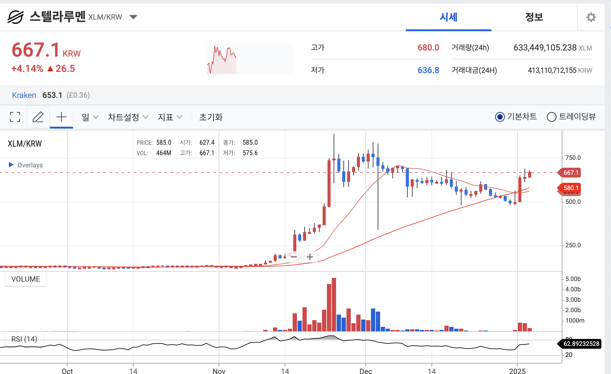 - 현재 667원을 돌파하고 680원 저항선을 넘길 경우, 750원까지 상승 가능성이 열려 있습니다.