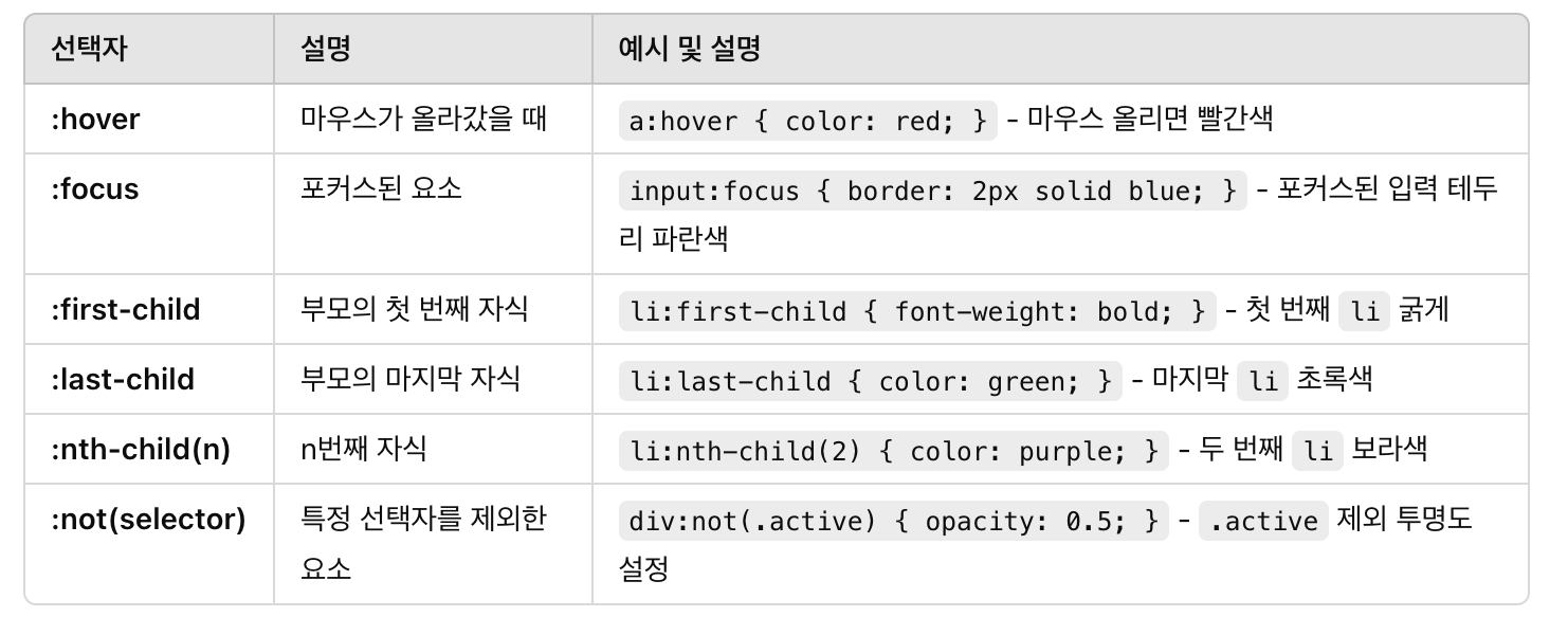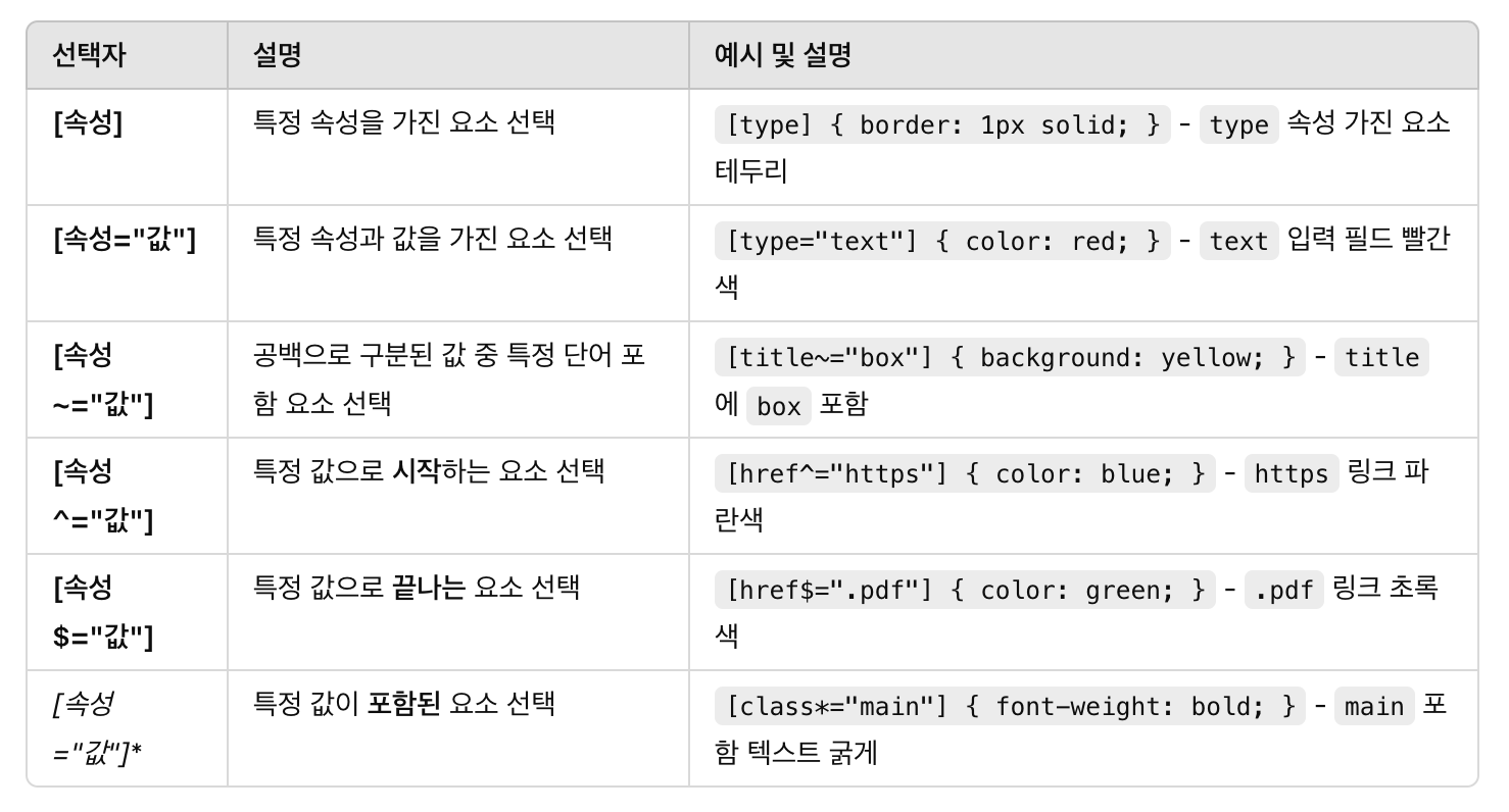 - 클래스 선택자, 속성 선택자, 가상 클래스 (.box, [type="text"], :hover)