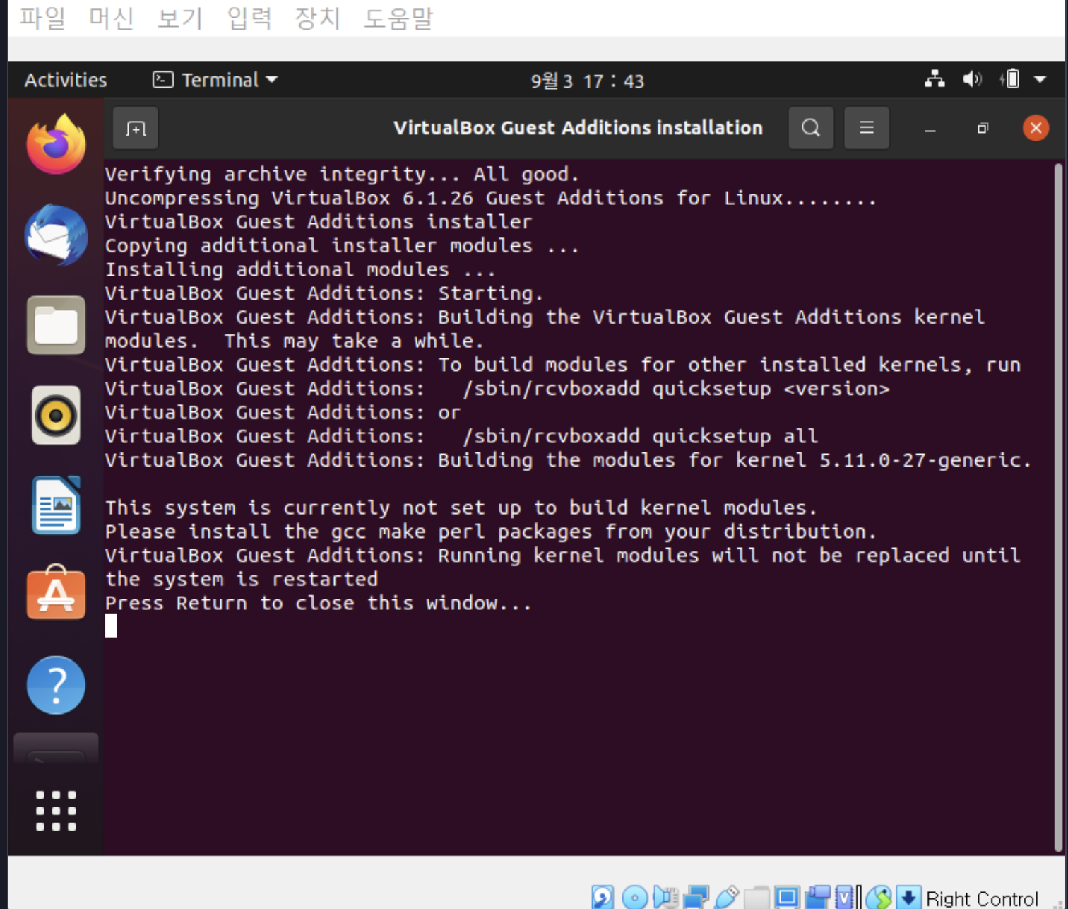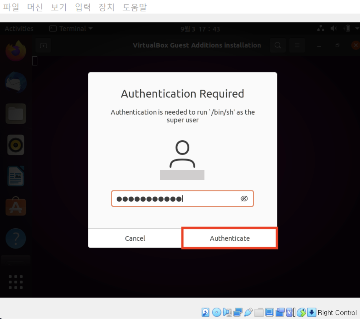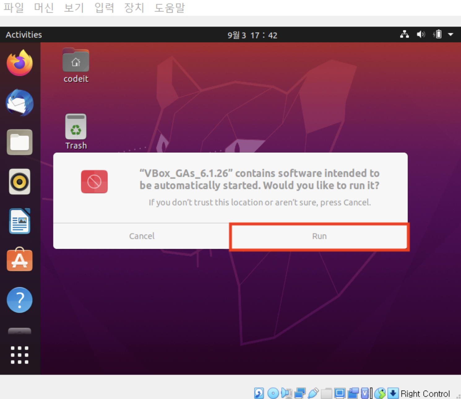 이것은 가상 머신에 가상 CD를 삽입하기 위함이며, 이 CD에는 사용자가 VirtualBox를 좀 더 편하게 사용할 수 있도록 도와주는 프로그램이 들어가 있습니다.