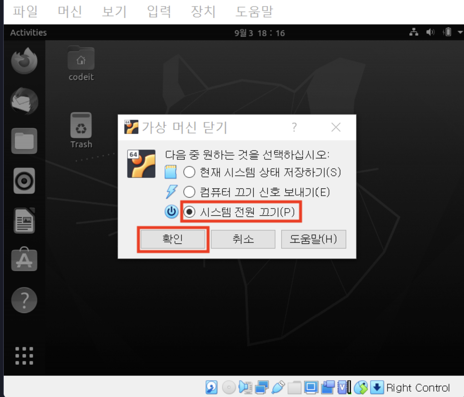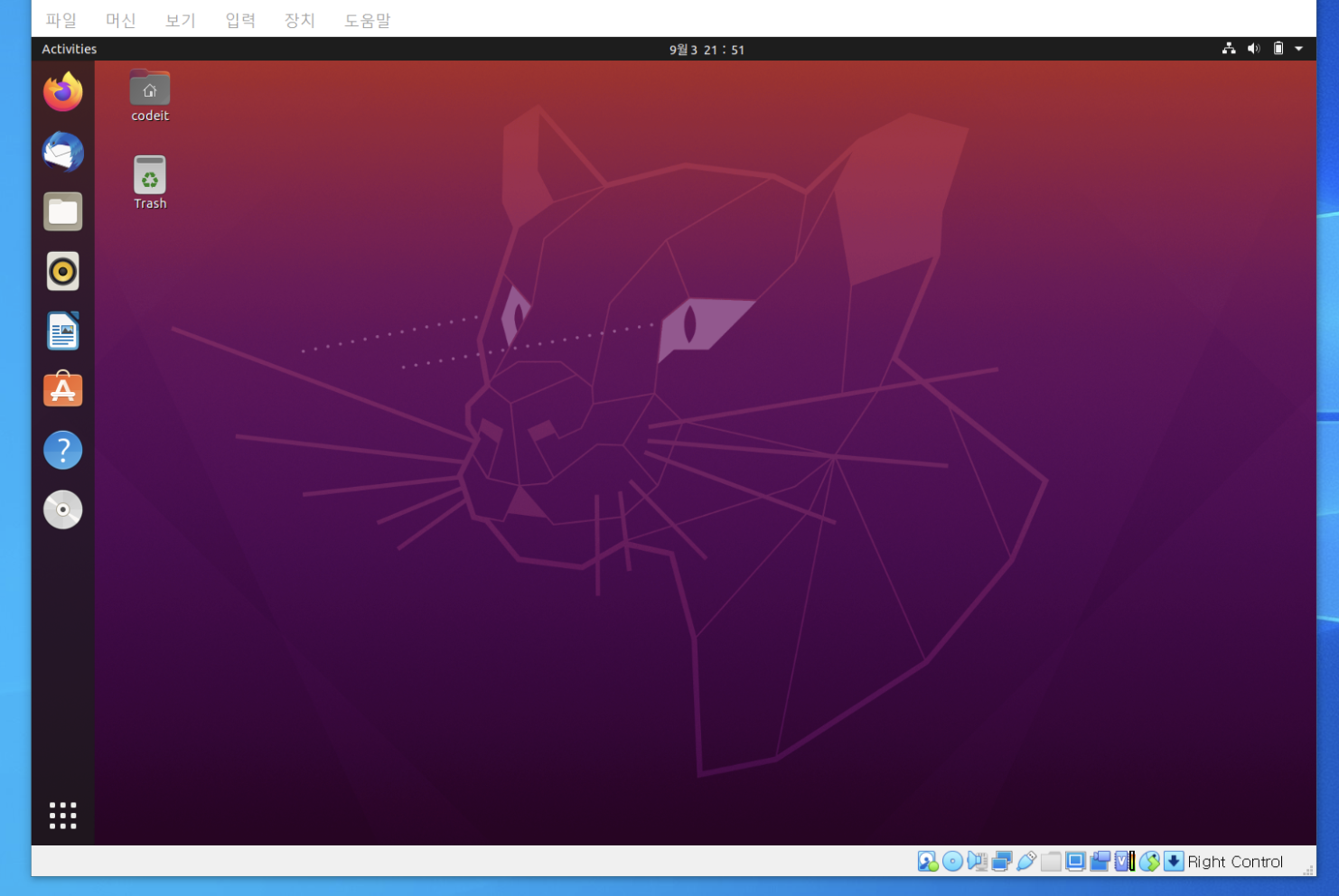 6. 다시 시작하면 머신의 화면 크기를 늘리면 그에 맞게 우분투의 바탕 화면도 커지는 것을 확인할 수 있습니다.