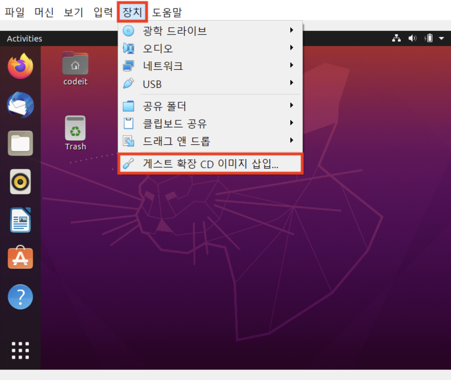 1. '장치' 탭의 '게스트 확장 CD 이미지 삽입'이라는 탭을 클릭합니다.