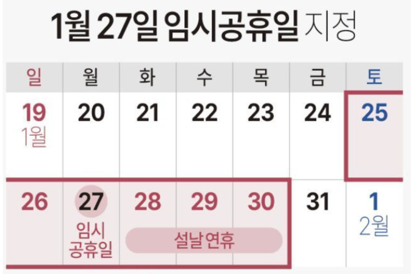 - 설 명절 전인 1월 27일을 임시 공휴일로 지정하는 안건이 1월 14일 국무회의에서 의결됨.