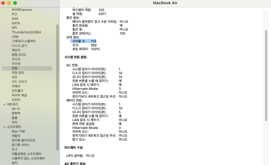 - 시스템 정보 윈도우의 하드웨어 섹션에서 '전원'을 선택 --> 현재 사이클 수가 배터리 정보 섹션 아래에 나열됩니다.