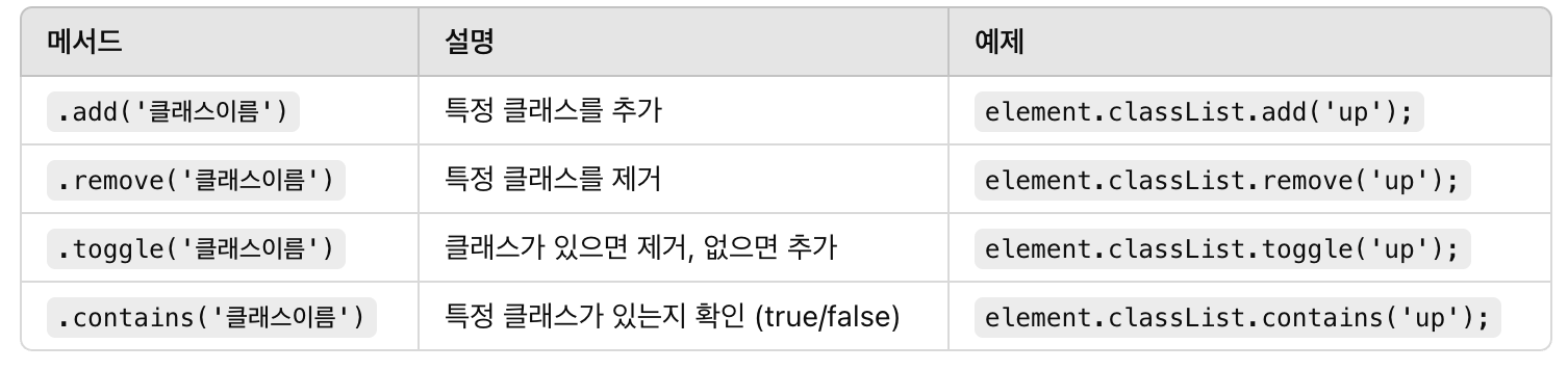 즉, HTML 요소의 class 속성을 쉽게 추가, 제거, 토글할 수 있도록 해주는 객체입니다.