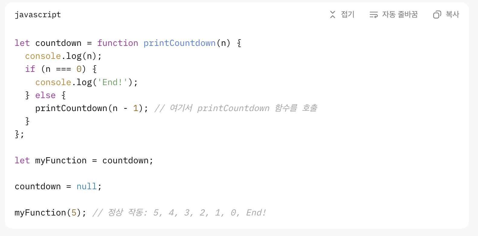 - 함수 내부에서 printCountdown라는 고유한 이름으로 자신을 호출하기 때문에, 외부 변수(countdown)가 null로 바뀌어도 영향을 받지 않습니다.