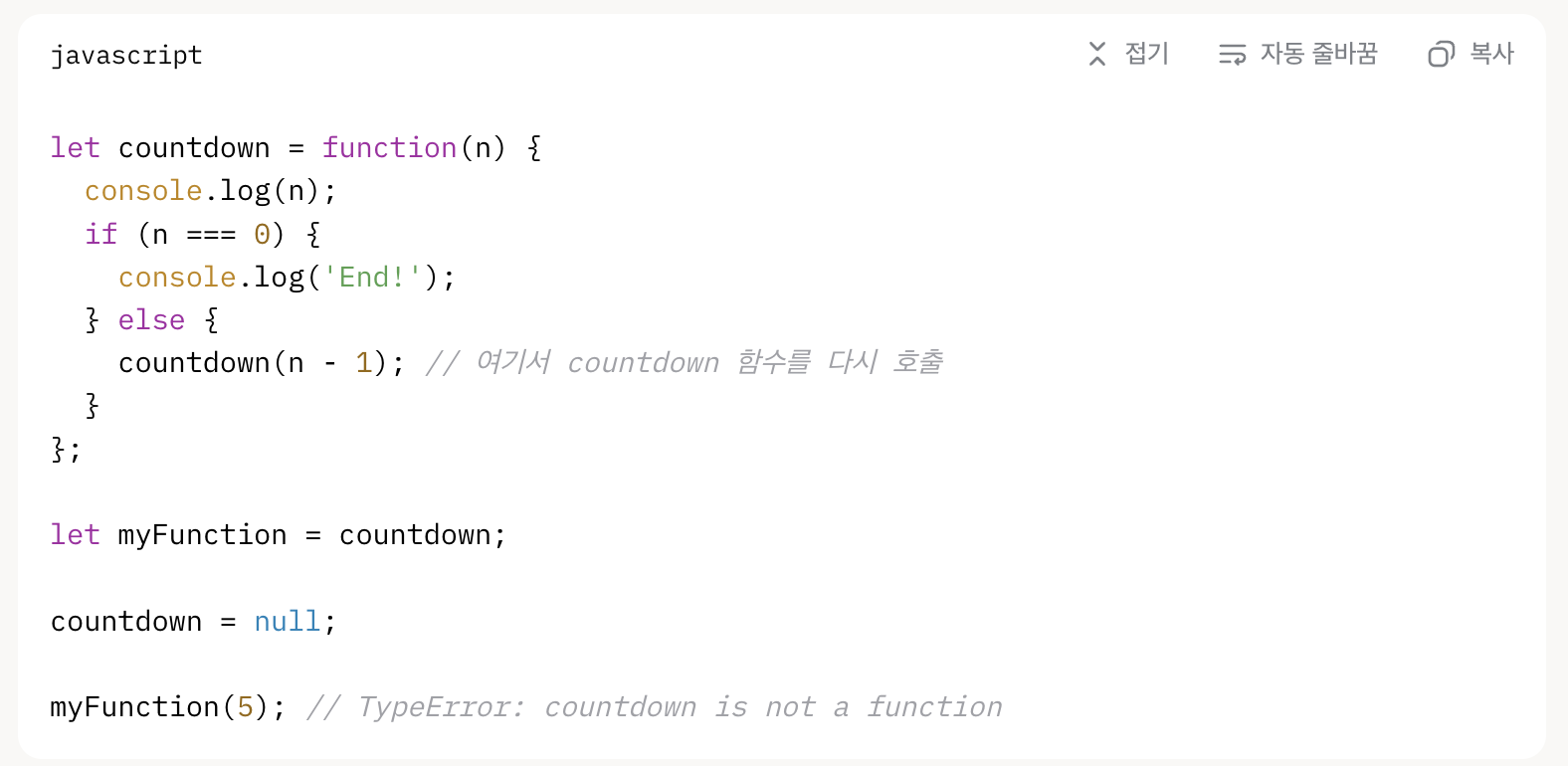 - myFunction(5)를 호출하면 함수가 실행되면서 countdown(n - 1)을 호출하려고 하지만, countdown은 이미 null이 되었기 때문에 "countdown is not a function"이라는 TypeError가 발생합니다.