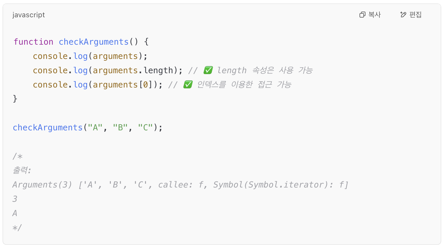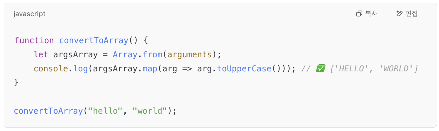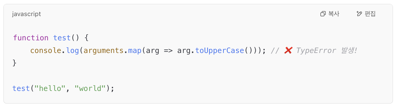 - arguments는 유사 배열 객체라서 length, 인덱스 접근은 가능하지만, map, filter 같은 배열 메서드는 직접 사용할 수 없다.