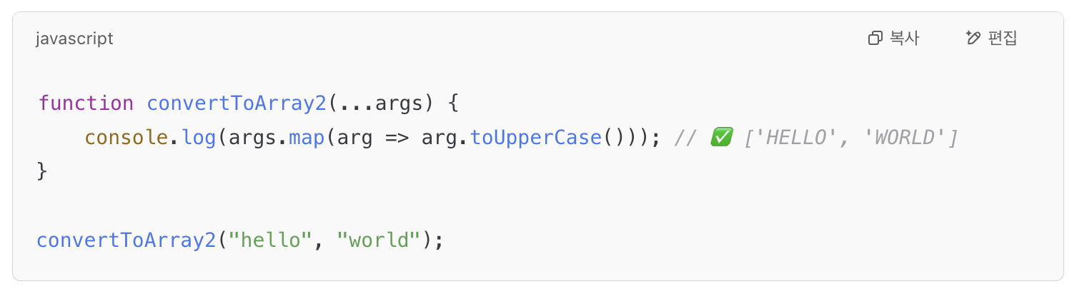 - 배열 메서드를 쓰려면 Array.from(arguments) 또는 ...args(전개 연산자) 를 사용하여 배열로 변환해야 한다.
