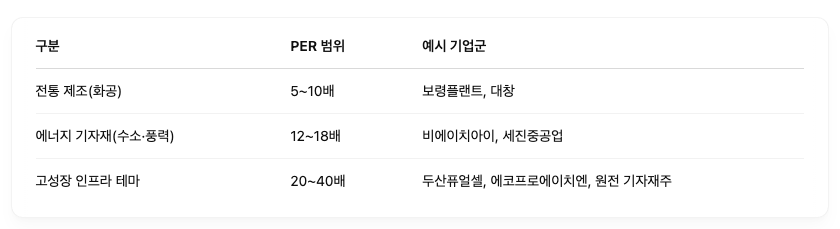 일반적으로 에너지 전환·수소·2차전지·CCUS·탄소감축 등 미래 성장형 산업에 속한 기업들은 시장 성장성 및 테마성으로 인해 PER 20~40배 이상까지 평가되곤 합니다.