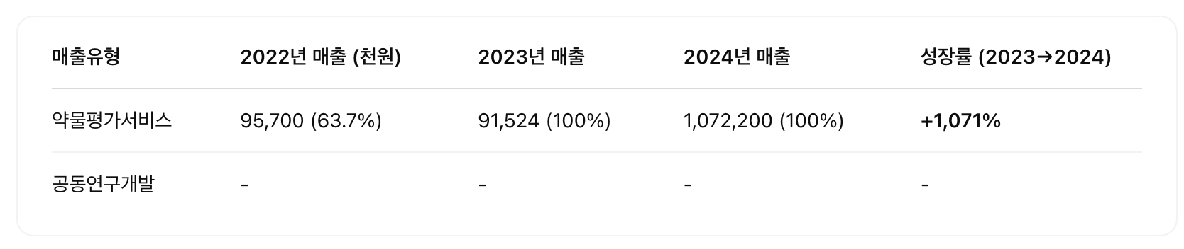 🔍 비록 단일 서비스 구조이지만, 수주 물량과 과제 범위가 커짐에 따라 매출이 급증한 것으로 분석됩니다. 향후 다변화를 위해 자체 파이프라인 개발이 병행되고 있음[온코크로스]사업보고ᄉ….