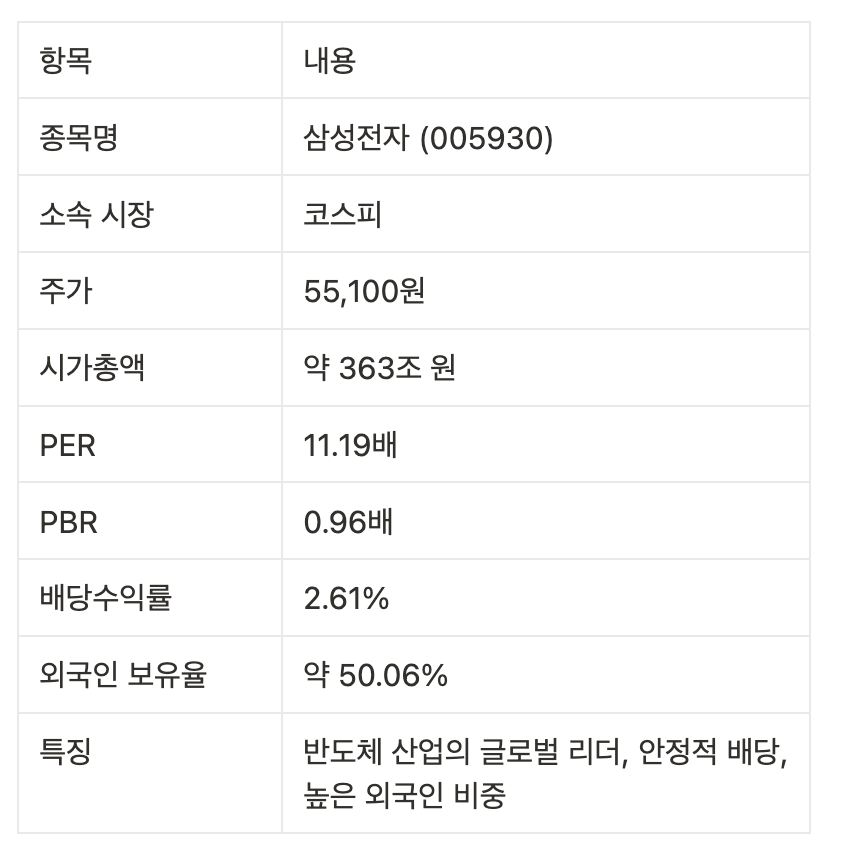 → 삼성전자의 주가는 2021년 고점(8만 원대)에서 하락했지만, 여전히 국내 주식시장의 핵심 종목입니다.