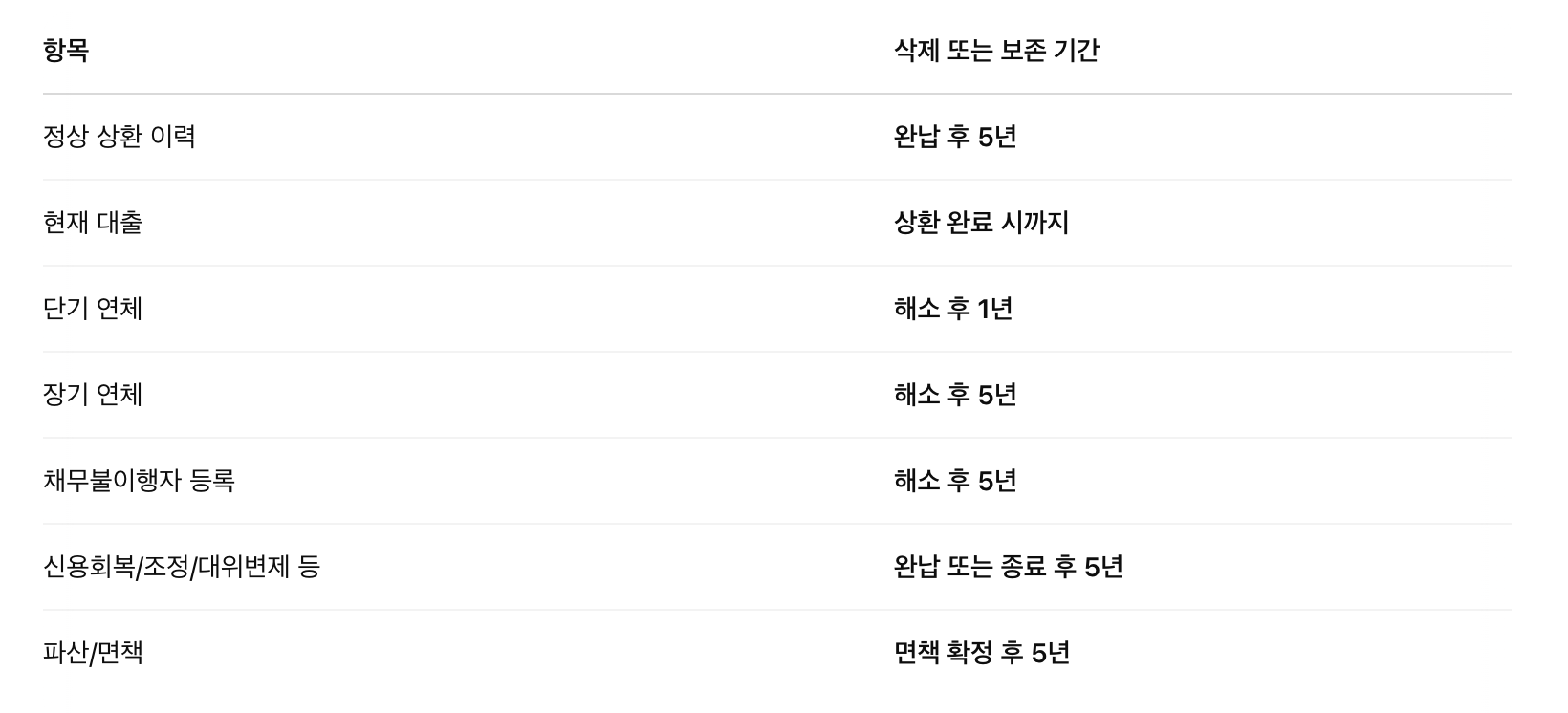 - 일반인 삭제 요청 불가: 정상적인 상환 이력은 신용평가의 핵심 자료이므로 본인이 요청해도 삭제되지 않음