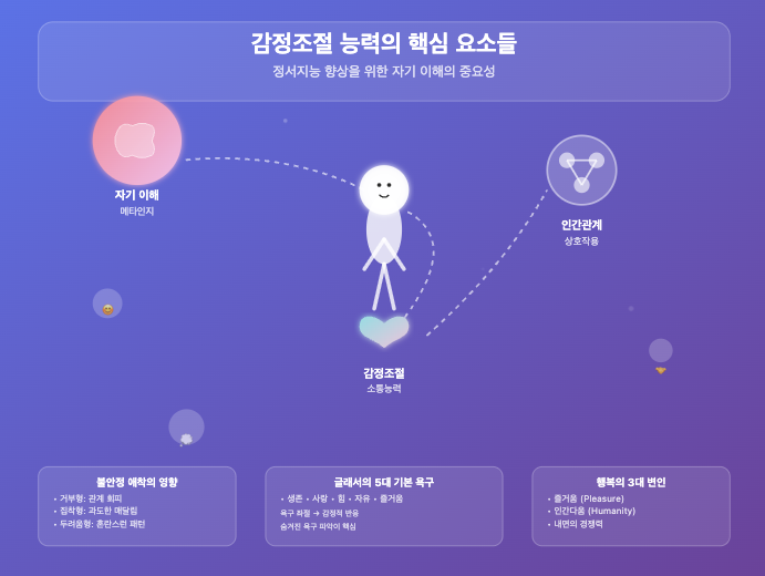**정서 지능(EQ)**은 단순히 감정을 억누르는 능력이 아닙니다. 자기 이해, 타인 이해, 상호 작용 능력의 세 가지 핵심 요소로 구성되어 있죠.