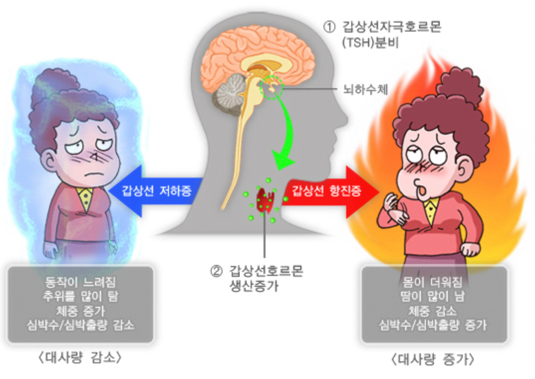 - 갑상선 기능 저하증: 호르몬 부족 분비
