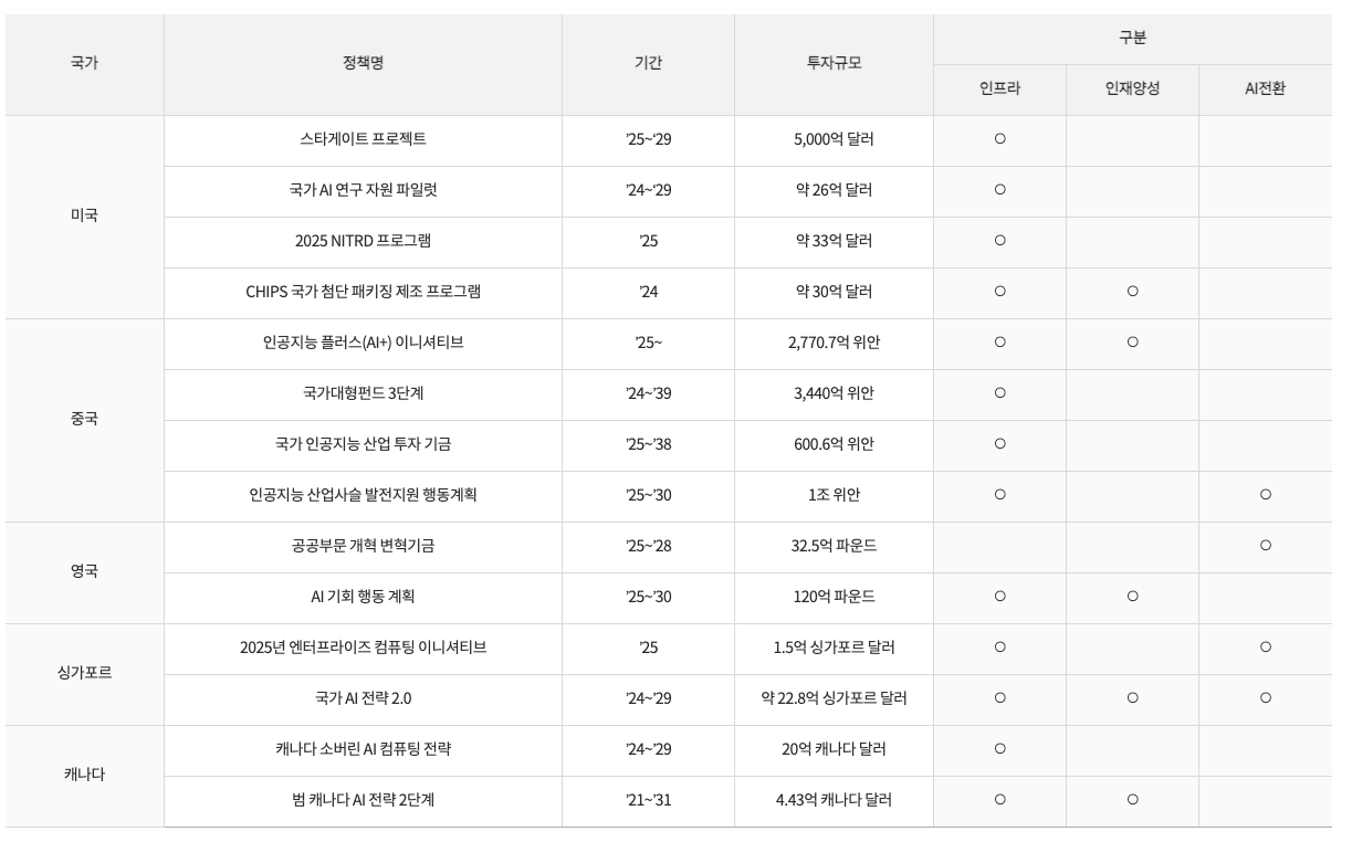 캐나다는 AI 컴퓨트 액세스 펀드와 주권 컴퓨트 전략에 5년간 20억 달러 투자를 발표했고, EU는 2027년까지 40억 유로를 AI 혁신 전략과 'AI 팩토리'에 투입할 계획이다. 중국 상하이는 약 146억 달러 규모의 AI 개발 펀드를 조성했다.