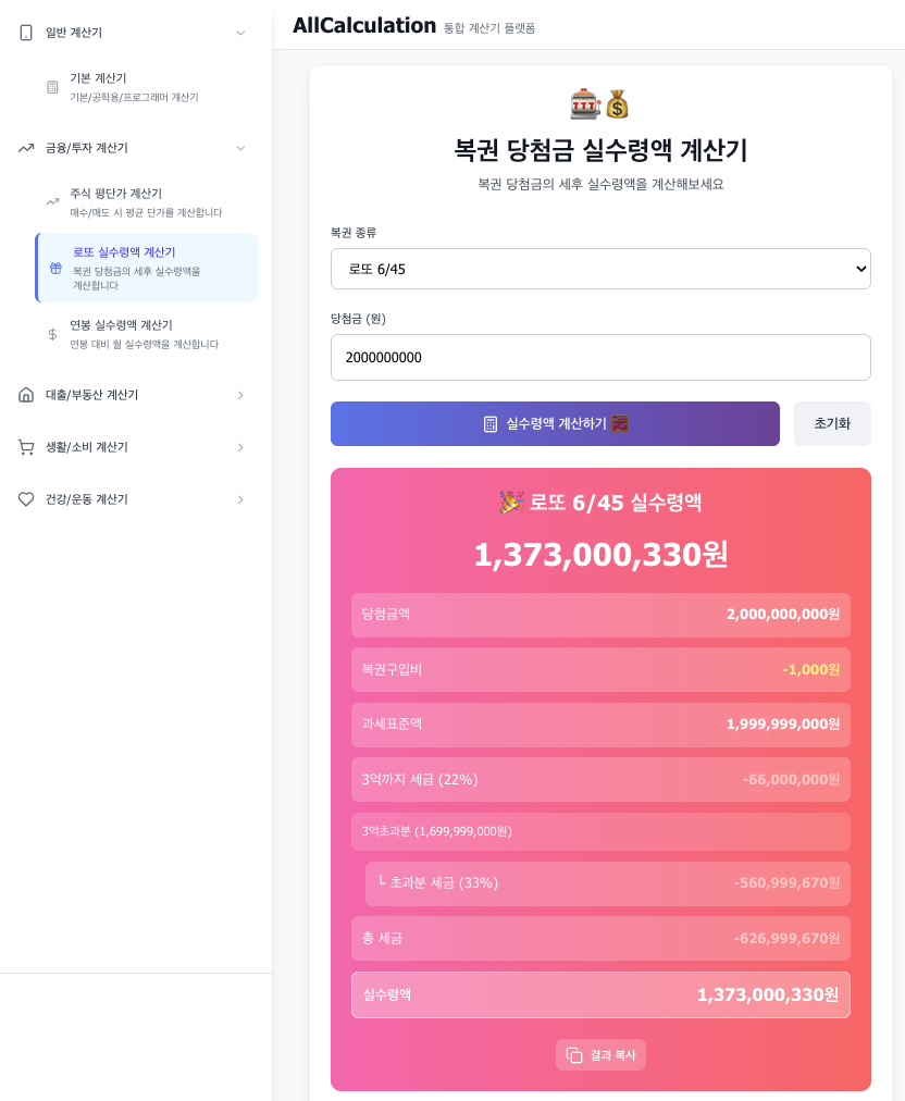 로또 당첨금의 실수령액도 당첨금만 입력하고 계산하기 버튼을 누르면 세부항목까지 자세히 볼 수 있게 구현해놓았구요,