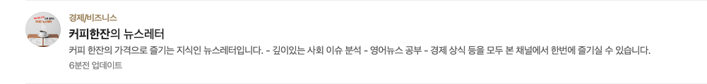 커피 한잔의 가격으로 즐기는 지식인 뉴스레터입니다. - 깊이있는 사회 이슈 분석 - 영어뉴스 공부 - 경제 상식 등을 모두 본 채널에서 한번에 즐기실 수 있습니다.