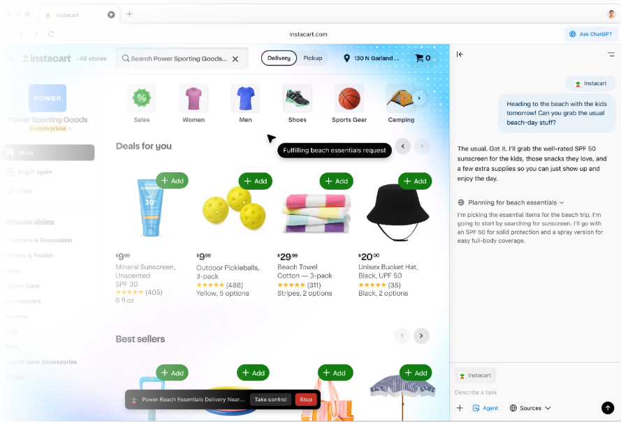 - 개인 업무(장보기): 레시피 페이지를 읽어 8인분 장보기 리스트 계산, 사용자의 선호 쇼핑 채널(예: Instacart/Safeway)로 이동해 장바구니 자동 구성.