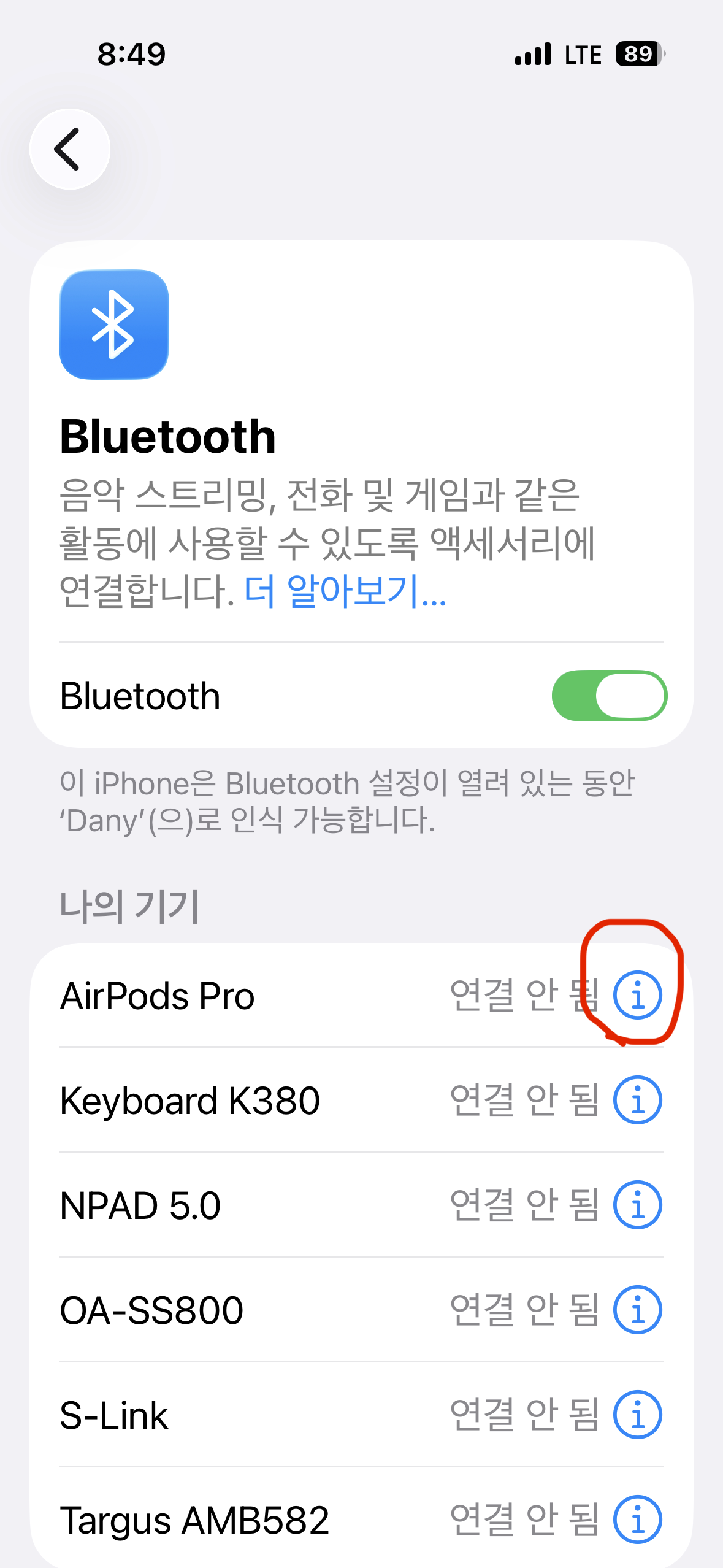 2. 목록에서 연결된 에어팟 옆의 'i' (정보) 아이콘을 누릅니다.