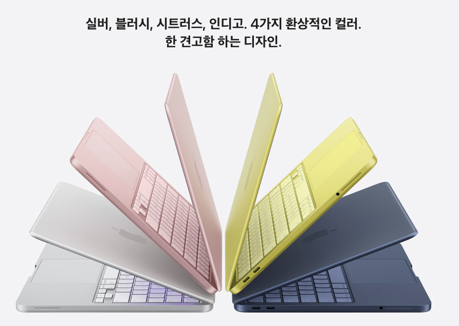 - 디스플레이: 13인치 리퀴드 레티나 디스플레이(500니트)를 탑재했습니다. 다만, 상위 모델과 달리 P3 광색역이 아닌 sRGB를 지원하며, 노치가 없는 깔끔한 베젤 디자인을 채택했습니다.