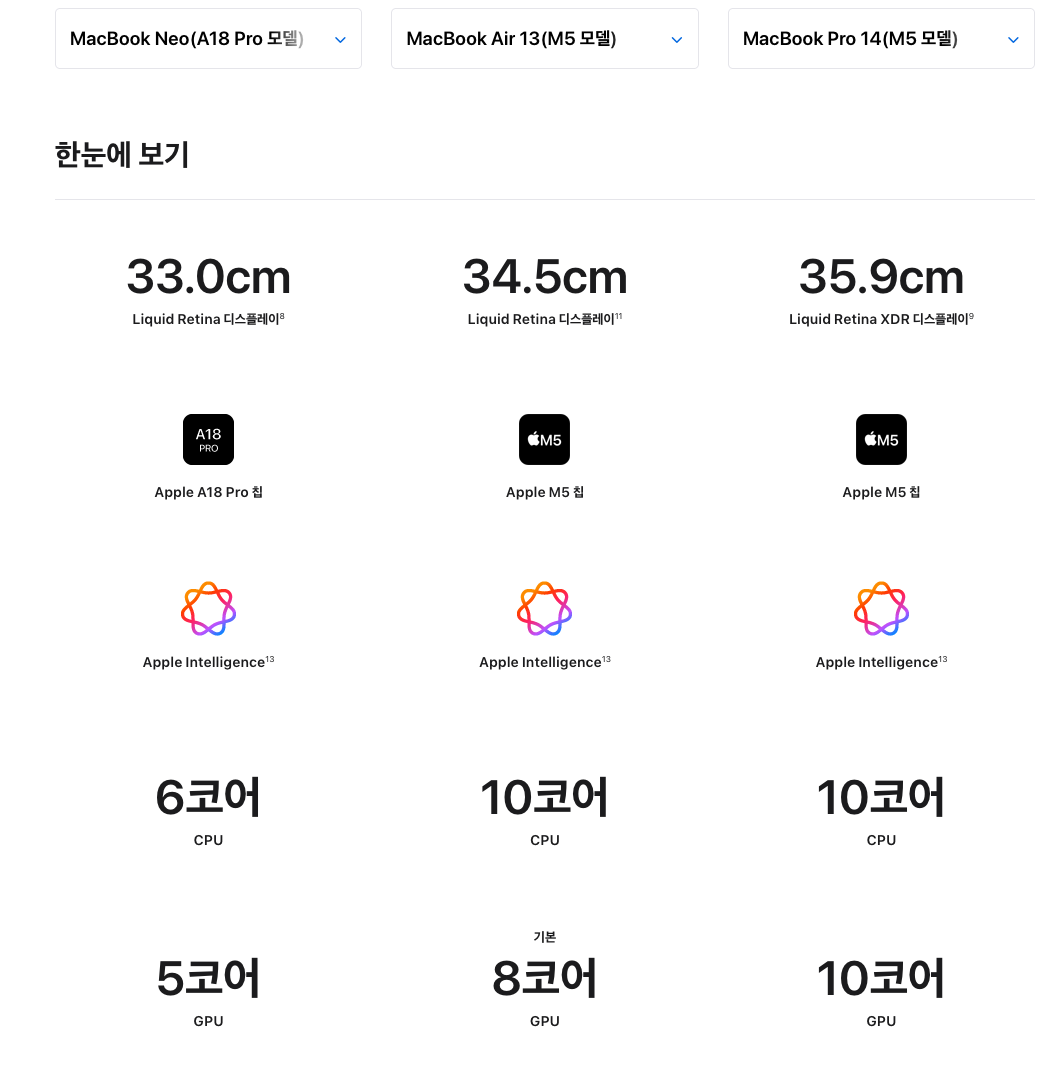 | 구분 | MacBook Neo (A18 Pro 모델) | MacBook Air 13 (M5 모델) | MacBook Pro 14 (M5 모델) |