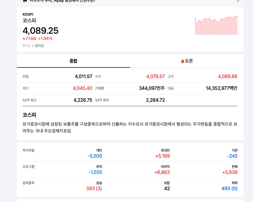 | 코스피 | 4,089.25 | +77.68 (+1.94%) | 4,000선 탈환, 오전 +2%대 후 안착 |