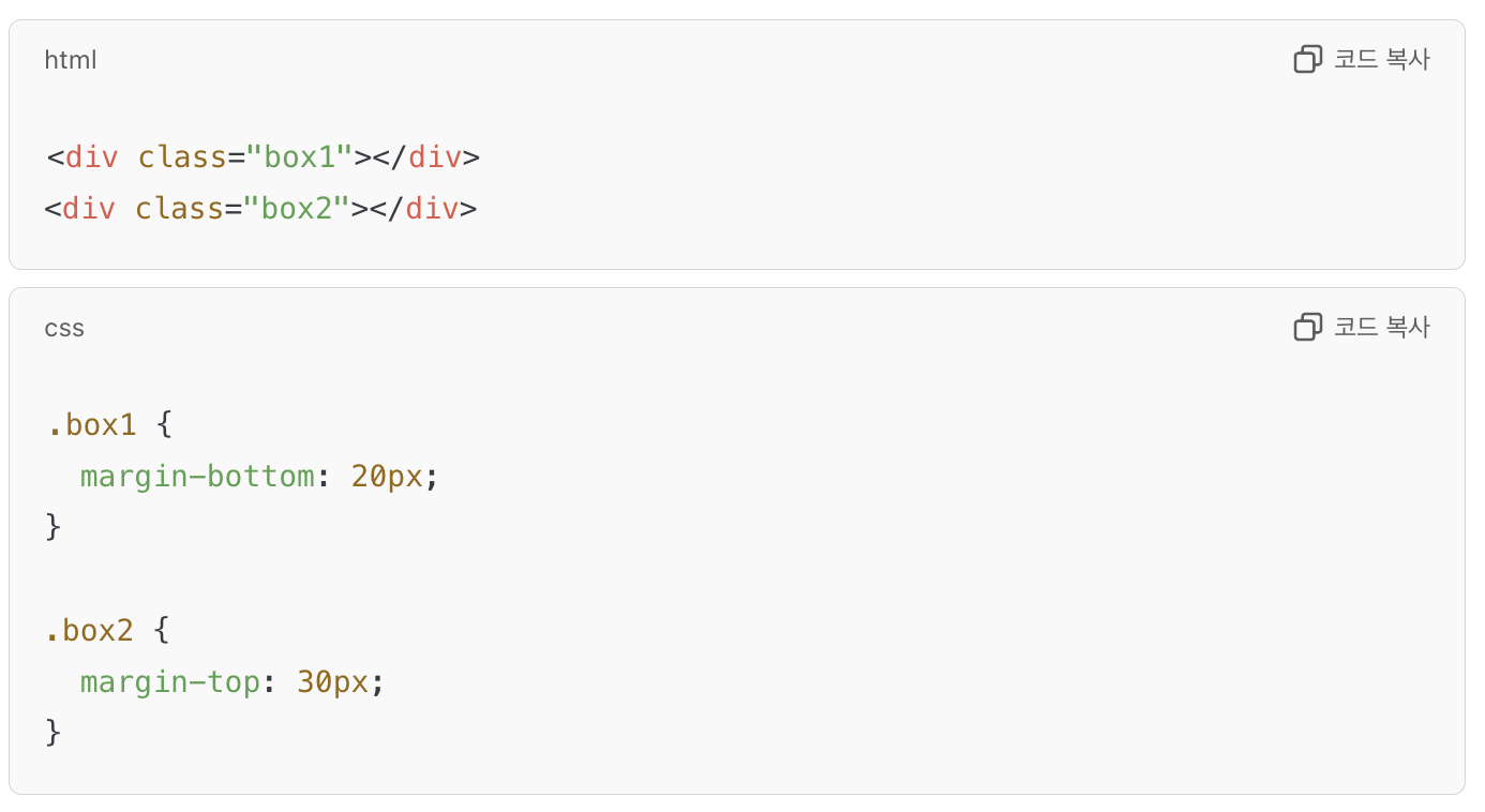 [지식루프의 웹개발공부] CSS의 margin 중복 (Collapse) CSS에서 마진 중복(Margin Collapse)은 인접한 블록 요소들의 상하 마진(margin-top, margin-bottom)이 겹쳐지는 현상입니다. 이 현상은 수직 마진에서만 발생하며, 수평 마진에서는 적용되지 않습니다. 마진 중복이 발생하면 두 요소의 마진이 합쳐지는 대신, 더 큰 마진 값이 적용됩니다. 이를 통해 예상치 못한 마진이 설정될 수 있으니, 이를 이해하고 관리하는 것이 중요합니다. # 마진 중복이 발생하는 경우 1. 인접한 블록 요소 간두 블록 요소가 위아래로 인접해 있을 때, 서로의 margin-bottom과 margin-top이 중복됩니다. 이때 더 큰 값이 적용됩니다. 이 경우, 두 블록 요소 사이의 간격은 50px이 아닌, 30px(더 큰 값)만 적용됩니다. 2. 부.. IT공부 2024.10.20