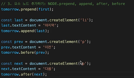 prepend, append, before, after의 차이.이는 JavaScript에서 DOM(Document Object Model)을 조작하는 방법인데, 각각의 메서드가 HTML 요소를 어떻게 다루는지 보여주고 있습니다.코드 분석*append (코드: tomorrow.append(last))의미: append는 특정 요소의 맨 끝에 새로운 요소를 추가합니다.코드 설명:last라는 요소(마지막)를 tomorrow라는 부모 요소의 맨 마지막 자식으로 추가해요.즉, tomorrow 요소 안에 이미 자식 요소들이 있다면, 그 뒤에 last가 붙습니다.예시 결과: 만약 tomorrow가 기존였다면, append(last) 후에는 기존마지막가 됩니다.*prepend (코드: tomorrow.prepend(f..